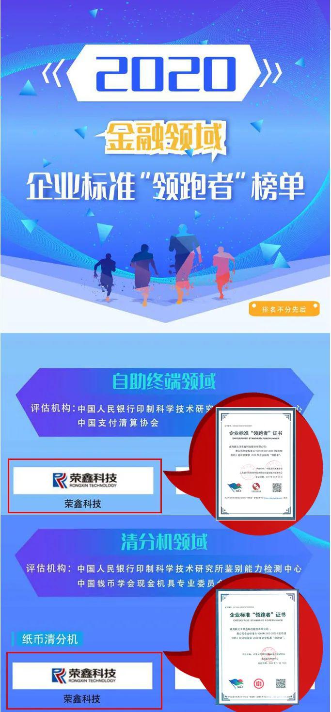 近日,由國家市場監督管理總局支持,中國人民銀行、中國銀行保險監督管理委員會、中國證券監督管理委員會共同組織開展的全國金融領域企業標準“領跑者”榜單公布,榮鑫科技憑借企業標準Q/1001RX 003-2020《綜合柜員機》、Q/1001RX 002-2020《紙幣清分機》榮獲2020年度金融領域企業標準“領跑者”稱號,以實力領跑自助終端和清分機兩大領域。